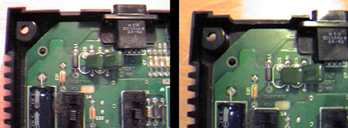 Even though the circuit board is a small size, fitting it into the tiny Atari Jr. case is a challenge. The upper left corner seems the best bet - there's just enough room for the board and the rear of the case can be cut out with a Dremel to accommodate the two new phono connectors as shown below in a before and after shot....