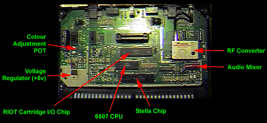 The above picture shows my board layout with the RF shielding removed. It's the 'Stella' chip that we're mainly interested in. This is sometimes referred to as the TIA chip (Television Interface Adaptor). All the component signals for composite video (and the audio signal) come from here. The Stella chip has forty pins and we are interested in the outputs of pins 2 (Sync), 5 (Luma 1), 7 (Luma 2), 8 (Luma 0), 9 (Chroma) and 13 (Audio). When correctly mixed together, these component signals form Composite video (the resultant signal being a composite of the five separate video signals). You could keep the signals separate and bring them out of the Atari as S-Video (aka S-VHS) but I decided to use composite video as more televisions have composite video inputs than S-Video inputs.