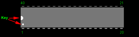 If you're not sure how the Stella chip's pins are numbered then here's how it works, In my Atari the Stella chip is mounted upside down. Pin 1 of any chip is denoted by the key which is either a semi circular cut-out or a painted dot or drilled hole. Some chips may have both the cut out and the dot. Orientate the chip so that the key is on the left side (as below) to find your pin numbers.