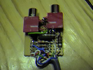 Shown below is the final stripboard layout of my circuit. The board itself is about 3.3cm square and can only just accommodate the components (but any bigger and it wouldn't fit into the Atari's case). The left phono socket is the composite video output and the right socket will be connected to the audio output of the Stella chip. The shields of both connectors need to be soldered to ground.