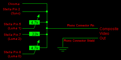 Picking up Luma 0 from Stella pin 6 rather than pin 8 and using the transistor amplifier as described above works for me. If all this has put you off then you don't necessarily need to go out and buy an expensive RF to composite converter - just try and track down someone with an old worn-out VCR which doesn't play tapes any more. Stop them from throwing it into the trash and you can use it as a signal converter. All you have to do is connect the RF output of the Atari into the aerial input of the VCR, tune in the VCR to the Atari's frequency and then connect the composite output of the VCR to the TV. It's not ideal as you're converting the digital Atari signals to analogue and then back again, but it will work.