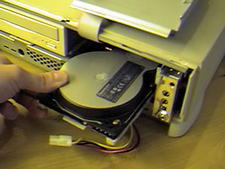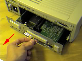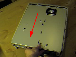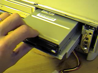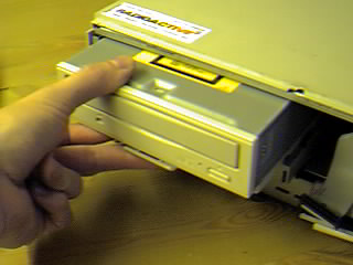 7. Push up the catch under the front of the CD-Rom drive and pull it forward to remove it (you may need to give it an initial tug to unplug it from it's internal connector).