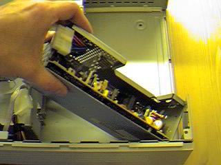 3. Pull down the wire handle and pull to remove the motherboard. It may require a sharp initial tug to unplug it's internal connector.