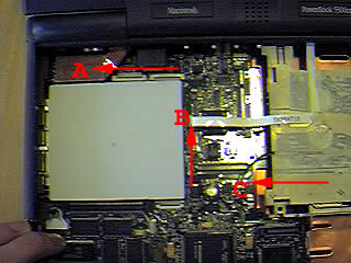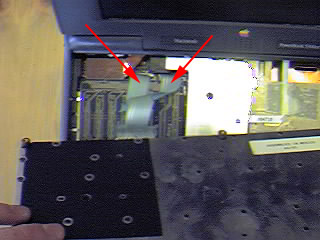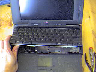 1. For this procedure you will need a Torx (star shaped) screwdriver. If you don't have one the right size you're not gonna get very far. If you do have one then remove the three screws from the underside of the unit. These screws hold the keyboard in place. Also release and remove the floppy drive and remove the torx screw on the rear of the PowerBook (next to the video output port).