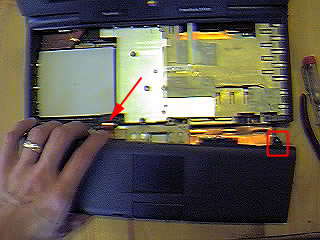 5.Disconnect the trackpad ribbon (arrowed below) and remove the trackpad and its surround by pulling it up from the top and releasing the clips at the front. Do it gently (it's a little awkward). You may have to lift the sides of the unit as the trackpad surround has two lugs (one shown below) which fit under the case sides.
